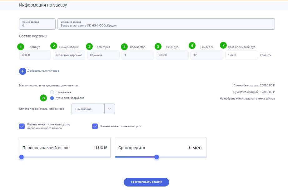 - в строку "Сумма" должна стоять сумма с учетом скидки. Например если тренинг стоит сейчас 20000 рублей и мы обещаем клиенту оформление рассрочки на 6 месяцев без переплаты, то необходимо сделать скидку 7% (12% в МФО) на эту сумму. В данном случае это сумма 17600 рублей.