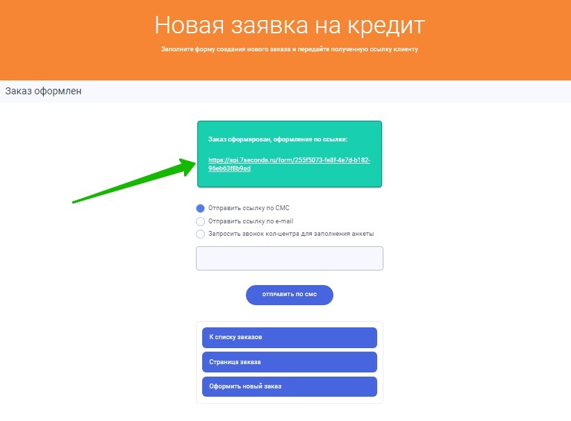Ниже будет предложено несколько способов отправить ссылку клиенту, это все игнорируем. В этом окне сразу нажимаем на ссылку сформированного заказа, чтобы заполнить анкету за клиента.
