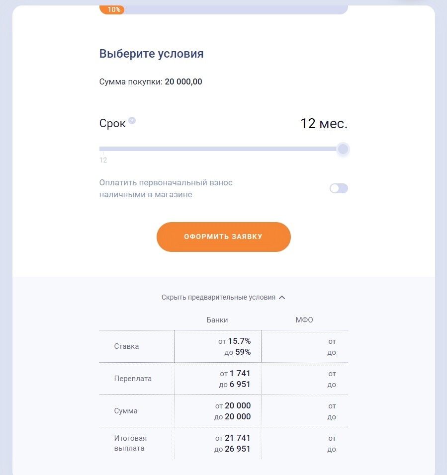 Это значит, что за счет скидки, клиент оформит рассрочку на сумму 17600 руб. Но с учетом процентов, которые надо будет выплатить банку (МФО), итоговая сумма, которая заплатит клиент за полгода будет 20000 рублей.