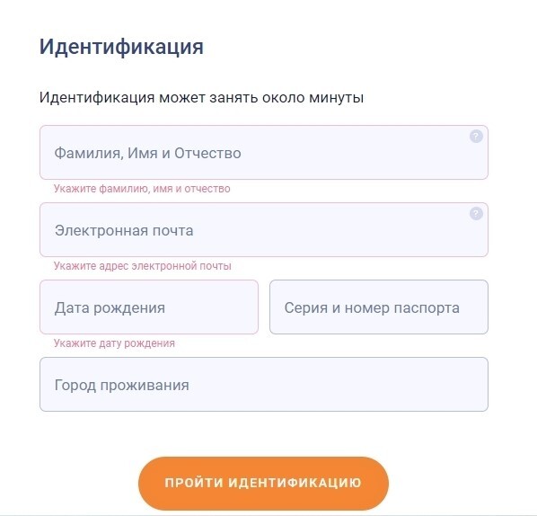 Нажимаем кнопку "Пройти идентификацию". Система проводит первичную проверку клиента. Проверяем данные и нажимаем кнопку "Указанные данные верные".