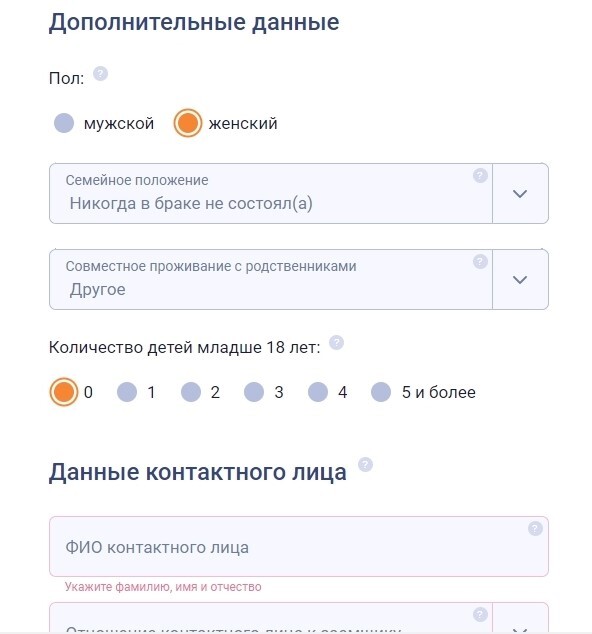 Заполняем "Данные контактного лица". Если вы замужем или женаты, то нужно будет указать контактные данные супруга(и):