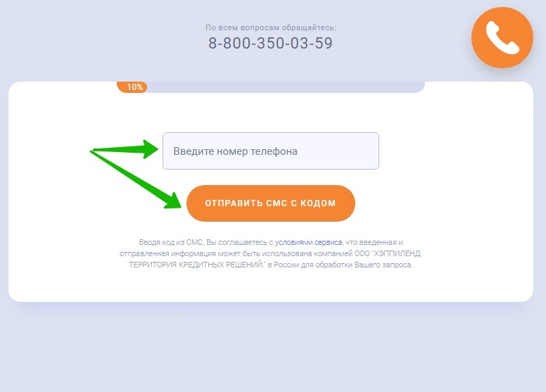 Когда смс придет на сотовый клиента, он должен вам его продиктовать. Вводим код и переходим к заполнению анкеты.