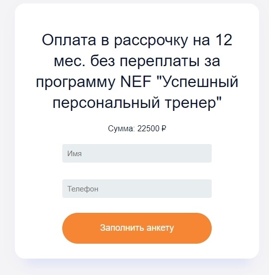 - Клиент переходит по ссылке, открывается окно, где надо ввести "Имя", "Телефон" и нажать на кнопку "Заполнить анкету".